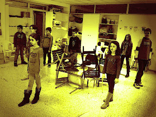 Che cosa abbiamo fatto, oggi? Le movenze da carillon. Gambe incrociate, rotazione sulla punta dei piedi, movimenti del busto in su e giù e delle braccia in alto in in basso, con saluto, espressione sorridente, sguardo fisso. La parte più difficile è come sentirsi sicuri sui piedi a gambe incrociate, e come tenere il movimento di rotazione a ginocchia leggermente flesse senza ingarbugliarsi. Infatti, qualcuno perde la posizione e inciampa. Si cambia musica. Due effetti sonori di passi, dapprima una camminata lenta, poi veloce. Devono effettuarla a braccia piegate discoste dal corpo con mani aperte a dita tese; quando s'incontrano devono ruotare sulle punte e cambiare direzione. Siamo ormai giunti al finale. Si sente un treno. Sistemano le sedie per dare l'idea di una carrozza e suggeriscono gli scossoni con sussulti verticali, salutando dai finestrini. Ma poi scoppiano i fuochi artificiali: in piedi sulle sedie a indicare il cielo con espressioni di meraviglia, gioia, entusiasmo. Un applauso prelude all'ultima musica. Siamo al circo. Do alcuni suggerimenti sulla postura da clown, sulla maschera facciale, sui movimenti da marionetta. Poi li invito a inventarsi delle gag. Bravi, davvero bravi. Intervengo per qualche rifinitura, ma sono loro a inventarsi la scenetta: tira e molla, litigi, risa, pianti, secchiate d'acqua, cadute... un circo davvero vivace.